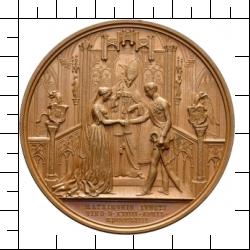 MATRIMONIO IVNCTI / VIND D XXIIII APRIL / MDCCCLIIII. Einsegnung des Paares durch den Wiener Erzbischof Joseph Othmar von Rauscher in der Wiener Augustinerkirche. Auf dem Chorgestühl links das bayerische, rechts das österreichische Wappen, von Löwen bzw. Adler gehalten. Im Abschnitt dreizeilige Aufschrift.