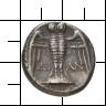 ΠEIPA. Eule mit ausgebreiteten Flügeln steht in der Vorderansicht auf einem Schild. Beiderseits der Magistratsname ΔI-AN. |