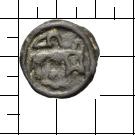 Figur mit Zopf geht nach r. In der r. Hand hält sie einen Speer und in der l. Hand einen Ring (torques). Stabrand. |