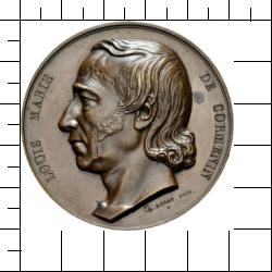 Cormenin (1788-1868) war Requetenmeister und Auditor beim Staatsrat. 1828 wurde er erstmals Mitglied der Abgeordnetenkammer. 1830 trat von seinen Ämtern zurück, um als Abgeordneter gegen die Regierung der Julimonarchie agieren zu können. Im Februar 1848 wurde Cormenin zum Mitglied und Präsidenten des Staatsrats ernannt. Dieses Amt gab er alsbald wieder auf, um nach seiner Wahl in die Nationalversammlung nicht in Konflikte zu geraten. Trotz seines Protestes gegen die Auflösung des Staatsrats durch Napoleon wurde er 1852 zum Mitglied des neuen kaiserlichen Staatsrats ernannt. Diese Medaillenrückseite wurde 1846 auch für eine Medaille auf Eugène Sue verwendet. Nach Collignon (1989) handelt es sich bei der Darstellung des Panthéon um die Ansicht des Gebäudes durch die Bäume des Jardin de Luxembourg.