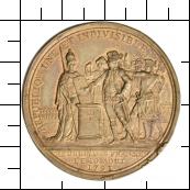 REPUBLIQUE UNE - ET INDIVISIBLE // REUNION DES FRANCOIS / LE 10 AOUT / 1793 [UE nach REPUBLIQ und S nach FRANCOI hochgestellt]. Vor einem Altar mit Aufschrift LIBERT / ÉGALITE steht rechts ein Mann in Uniform und legt seine rechte Hand zum schwur auf eine von Minerva/Francia mit Speer gehaltene Verfassungstafel mit dem allsehenden Auge und angedeuteter Schrift. Dahinter steht Justitia mit Waage in der rechten Hand sowie vier Männer mit zum Schwur erhobenen Händen. Im Hintergrund eine Menschenmenge. |