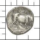 ΘΟΥΡΙΩΝ. Stier stoßend mit gesenktem Kopf, erhobenem Vorderbein nach r. Über dem Stier ΣΩΓ, unter Stier ein Vogel. Zwischen den Hinterbeinen AP in Ligatur. Im Abschnitt zwei Fische nach r.