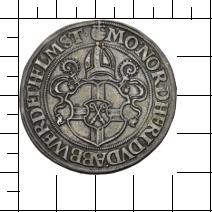 MO NO R D HERI DVD WERD ET HELMST. Unter einer Mitra und über zwei gekreuzten Krummstäben das Wappen der Abtei Werden. Am Ende der Umschrift ein Reichsapfel. |