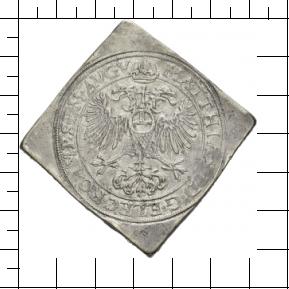 MO NO ARG REV D HVGONIS ABB IN WERDEN ET HELMS. Unter einer Mitra und auf einem Burgunderkreuz, dessen Enden in die Umschrift ragen, ein mit zwei Krummstäben bestecktes, verziertes sechsfeldiges Wappen (Feld 1 und 6: Bildnis des Heiligen Liudger mit Mitra und liturgischem Gewand, in erhobener Rechter Krummstab, 2 und 4: Wappen der Abtei Werden, 3 und 5: Familienwappen Hugo Preutäus). Am Ende der Umschrift das Münzmeisterzeichen Lilie (Wintgens).