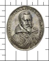 IO TS C DE TYLLI B MAR D BAL ET MO CAP GEN [Iohannes Tscerclas Comes De Tylli Baro de Marbays Dominus de Balast et Montigni Capitaneus Generalis. dt.: Johannes t'Serclaes von Tilly, Freiherr von Marbay, Herr von Balatre und Montiny, Generalkapitän]. Brustbild des Johannes Tilly im Harnisch mit Feldbinde in Dreiviertelansicht nach rechts. Im l. F. ein Graffito F. |