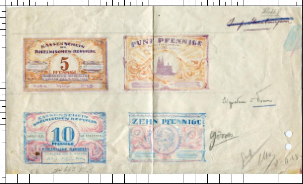 Aquarellskizzen für Geldscheine zu 5 und 10 Pfennige mit Anmerkungen.