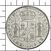 HISPAN ET IND REX Mo 8 R F M. Bekrönter Wappenschild. Aussen die Säulen des Herkules, darauf Bänder mit PLUS VLTRA. In Fortführung der Umschrift das Münzstättenzeichen Mo (für Mexiko), die Wertangabe 8 Reales sowie die Initialen F M. |