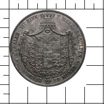 2 THALER VII EINE - F MARK 3 1/2 GULDEN - VEREINS 18-40 MÜNZE. 14-feldiges Wappen auf gekröntem Wappenzelt, umzogen von der Kette des Schwarzen Adlerordens. Unten die Jahreszahl. Auf den untersten Falten des Wappenmantels l. und r. die Signatur L-H (August Ludwig Held). |