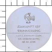 Bildseite: Inspiriert durch die beiden Raben Hugin (Gedanke) und Munin (Erinnerung) die dem Allvater Odin dienen, habe ich für die Geburtstagsmedaille ein Rabenpaar gewählt. Die Raben umschwirren sich hoch am Himmelszelt vor den Sternen der Milchstraße. Der linke Rabe ist ein Männchen, deutlich am kräftigen Nackenbereich und den starken Schwingen zu erkennen. In den linken Flügel habe ich in nordischen Runen LUTZ geschrieben. Der rechte über Kopf fliegende Rabe ist ein Weibchen, mit zarteren Schwingen und schmalem Kopf. Sie trägt die Runen für KATI am rechten Flügel. Auf der Innenseite dieses Flügels der Familienname FAHRON.