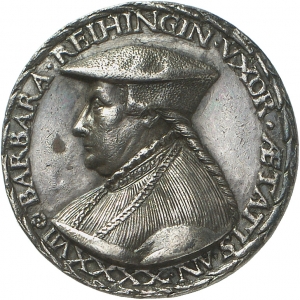 Vorderseite: BARBARA REIHINGIN VXOR AETATIS AN XXXXVII [AE ligiert, Trennungszeichen Blume]. Brustbild der Barbara Hermann-Reihing mit Mütze und langem Zopf, Schmuckkette über dem Busen, nach links. Laubrand.