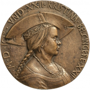 Vorderseite: M D IOR VND XXII KRISTINA BELCINGERE XXII. Brustbild der Christine Beltzinger mit langem Zopf und perlenbesetztem Stirnband unter einem breiten Hut. Feine, mehrfach geknüpfte Kette auf dem bloßen Hals.