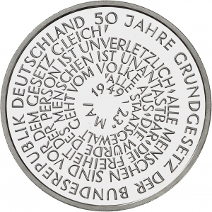 Vorderseite: 50 JAHRE GRUNDGESETZ DER BUNDESREPUBLIK DEUTSCHLAND 23. MAI 1949 ALLE STAATSGEWALT GEHT VOM VOLKE AUS DIE WÜRDE DES MENSCHEN IST UNANTASTBAR DIE FREIHEIT DER PERSON IST UNVERLETZLICH ALLE MENSCHEN SIND VOR DEM GESETZ GLEICH. Schrift in Form einer Spirale.