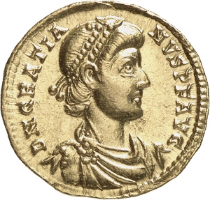 Zu dieser Zeit arbeiteten drei Offizine in Trier. Zum Kürzel OB/Aurum obryzum/solidus obriziacus, in Gebrauch seit Anfang 368 n. Chr., s. Ph. Grierson - M. Mays, Catalogue of Late Roman coins in the Dumbarton Oaks Collection and in the Whittemore Collection (1992) 50. 53 f. - Flavius Gratianus wurde am 18.4.359 n. Chr. als Sohn des späteren Kaisers Valentinianus I. und der Marina Severa in Sirmium geboren. Bereits am 24.8.367 wurde er zum Augustus ernannt und heiratete im Jahre 374 die Constantia, eine Tochter des Constantius II. Seit dem Tode seines Vaters herrschte er selbstständig im Westen des Reiches. In der Folge des Todes des Valens ernannte Gratianus den Theodosius am 19.1.379 n. Chr. zum Mitherrscher. Als seine Gattin 383 n. Chr. starb, heiratete er kurz darauf die Laeta. Am 25.8.383 wurde Gratianus von einem Kommandeur des Usurpators Magnus Maximus in Lyon gefangen genommen und getötet.