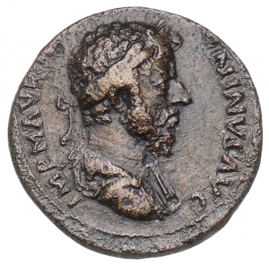 Vorderseite: M P M AVP - [ANTO]-NINVS AVG. Drapierte Panzerbüste des Marcus Aurelius mit Lorbeerkranz in der Rückenansicht nach r.