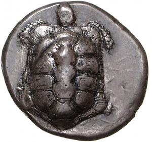 Rückseite: Α-ΙΓΙ. Incusum aus zwei Quadraten und zwei Rechtecken, darin oben l. Α, oben r. ΙΓΙ und unten l. ein Delphin, unten r. eine Diagonale.