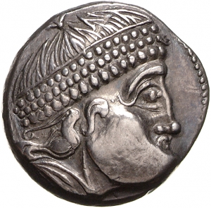 Vorderseite: Bartloser Männerkopf (Vorbild Zeuskopf) mit dreifachem Perlkranz, strengem Gesichtsausdruck und Halsschmuck nach r. Punktrand.