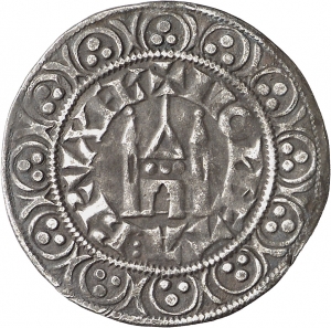 Obverse: + MONETA BRVXEL [Moneta Bruxelles]. Burg und Legende umgeben von zwölf Kreisen mit drei Punkten (stilisierte Lilien).
