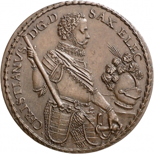 Vorderseite: CHRISTIANVS - D G D - SAX ELEC. Dreiviertelbildnis des Kurfürsten Christian II. mit Schwert, Rüstung und Marschallstabe nach rechts, der Helm ist rechts abgelegt.