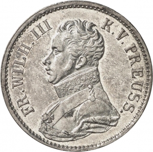 Literatur: F. Freiherr von Schrötter, Das Preussische Münzwesen 1806 bis 1873, Beschreibender Teil (1925) 8 Nr. 175; P. Arnold - H. Küthmann - D. Steinhilber, Grosser deutscher Münzkatalog von 1800 bis heute. 19. Auflage (2003) 268 Nr. 12; J. S. Davenport, European Crowns and Talers since 1800 (1964) Nr. 758; W. Steguweit - B. Kluge, Suum Cuique. Medaillenkunst und Münzprägung in Brandenburg-Preußen (2008) Nr. 218 (dieses Stück).