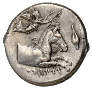 Vorderseite: QRTHDST [Punisch für 'Karthago']. Pferdevorderteil (protome) mit Zaumzeug und Zügeln nach r. springend. Davor Getreidekorn, darüber fliegt Nike nach r., den Pferdekopf bekränzend.