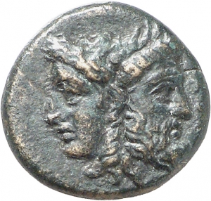 Vorderseite: Ianuskopf, l. weiblich, r. männlich mit Bart und Lorbeerkranz. Im r. F. [ΣΑ].