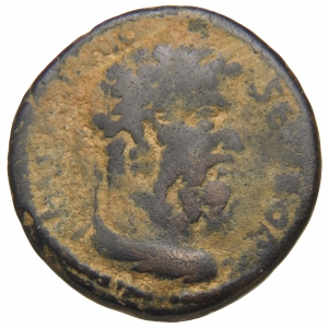Rückseite: [I] O M H / COL HEL [Iovi Optimo Maximo Heliopolitano = Iupiter Heliopolitanus dem Besten und Größten]. Iupitertempel von Heliopolis-Baalbek mit zehn Frontsäulen in der Dreiviertelansicht auf Podium mit breitem Treppenaufgang.