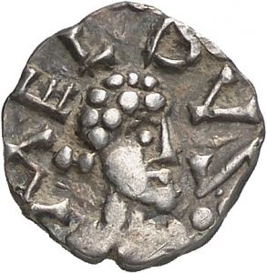 Publications: A. de Belfort, Description générale des Monnaies Mérovingiennes II (1892 Nachdruck 1996) Nr. 2869; M. M. Prou, Les Monnaies Mérovingiennes (1892) Nr. 890; M. Prou - E. Bougenot, Catalogue des Deniers Mérovingiens de la Trouvaille de Bais (Ille-et-Vilaine) ²(Original 1908 Neubearbeitung durch J. Lafaurie 1981) Nr. 105 Taf. 3 (dieses Stück, Vergrabung datiert um 740); G. Depeyrot, Le numéraire Mérovingien l'Age du denier (2001) 62 Nr. 3 (dieses Stück erwähnt, Vergrabung des Hortes gegen 735-740).