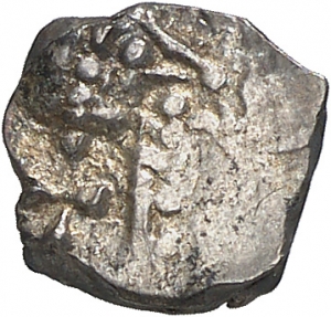 Obverse: Büste mit Diadem nach rechts, davor eine erhobene Hand oder ein Palmzweig (?), dahinter ein Kreuz.