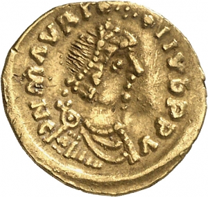 Triens zu sieben Siliquen. Nach dem Vorbild einer Münze des Mauricius Tiberius (regierte 582-602).