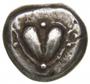 Die Vorderseite dieser Münze zeigt die herzförmige Silphionfrucht oder einen Samen der Pflanze, die Rückseite wahrscheinlich die ganze Silphionpflanze, welche im Altertum an der libyschen Küste, also im Prägegebiet der vorliegenden Münzen, wuchs. Die Milch der Silphionstaude galt in der Antike als vielseitig einsetzbares Heilmittel. Zusätzlich wurde die Pflanze als hochwertiges Mastfutter in der Viehzucht verwendet, wodurch wahrscheinlich ihr Aussterben noch in der Antike zu erklären ist.
