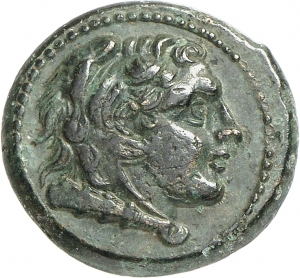 Vorderseite: Kopf des Hercules mit Löwenfell nach r. Darunter eine Keule.