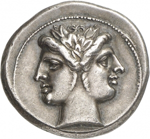 Vorderseite: Janusförmiger Dioskurenkopf mit Lorbeerkranz.
