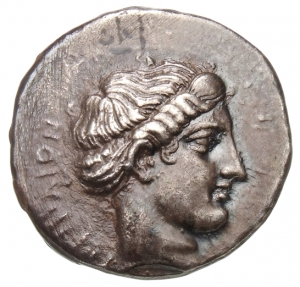 Obverse: TEPINAION. Weiblicher Kopf (die Nymphe Terina?) mit Bändern (ampyx und sphendone) im Haar nach r.