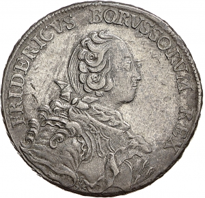 Vorderseite: FRIDERICVS BORVSSORVM REX. Brustbild Friedrich II. mit Harnisch, Ordensband mit Kreuz und Hermelinmantel nach rechts.