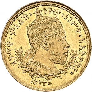Die äthiopische Datierung der Münzen beginnt sieben Jahre und acht Monate nach dem Startdatum der in Europa üblichen christlichen Zeitrechnung. - Die Stempel für diese Goldmünzen wurden in Wien 1903 nach Entwürfen von Jean Lagrange und Jules C. Chaplain und mit Stempeln von Franz Xaver Pawlik und Anton Scharff hergestellt und nach Addis Adeba verbracht.