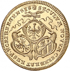 Vorderseite: SECVLVM NOVVM CELEBRAT RESP NORIBERGENSIS [Die Stadt Nürnberg feiert den Beginn des neuen Jahrhunderts]. Umschrift, im Feld dreiteiliges Stadtwappen von Taube überhöht. Oben das Münzmeisterzeichen Kreuz.