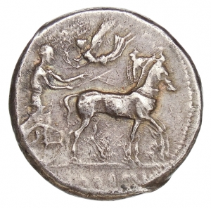 Vorderseite: IMERA[ION] [retrograd]. Viergespann (quadriga) im Schritt nach r. Der Wagenlenker wird von einer von r. heranfliegenden Nike bekränzt.