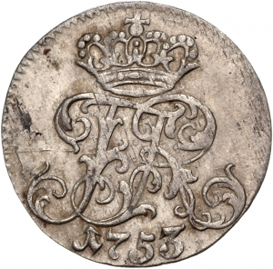 Vorderseite: Gekrönte verschlungene Initiale FR, darunter Jahreszahl 1753.