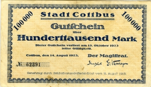 Vorderseite: Stadt Cottbus Gutschein über Hunderttausend Mark. Dieser Gutschein verliert am 15. Oktober 1923 seine Gültigkeit [...]. Wertangabe, Ausgeber.