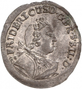 Rückseite: 2 / GRÖSCHEL / 1747. Der gekrönte preußische Adler mit Zepter und Reichsapfel, Wertzahl 2 zwischen dem Schweif des Adlers, unter der Jahreszahl die Münzmeisterinitiale AE (Adam Heinrich von Ehrenberg), auf der Brust des Adlers gekrönte Initiale FR.