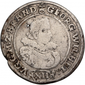 Vorderseite: GEORG WILHEL - V G G M Z BRAND. Brustbild des Kurfürsten Georg Wilhelm nach rechts. Oben Reichsapfel, unten Wertangabe XII.