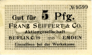 Vorderseite: Gut für 5 Pfg. FRANZ SEIFFERT & CO. Aktiengesellschaft BERLIN C.19 EMDEN Einzulösen bei der Werkskasse. Wertangabe, Ausgeber.
