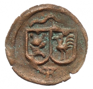 Vorderseite: Zwei kleine Schilde am Band nebeneinander mit Helm und Hahn. Unten F.