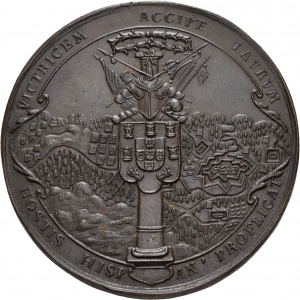 Vorderseite: HOSTIS HISPAN PROFLIGAT - VICTRICEM ACCIPE LAVRVM. Siegesmal mit Harnisch und Wappenschild von Portugal vor der Ansicht einer Festung (Fort Arrayal/Castello Real).