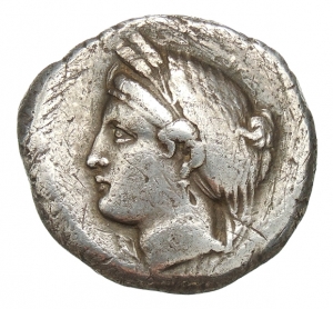 Vorderseite: [ΣOTEIPA]. Kopf der Kore Soteira mit Sakkos, Getreideähren und Ohrring nach l.