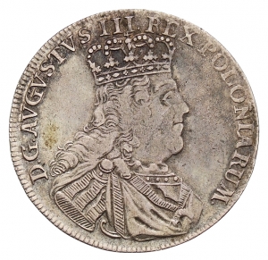 Vorderseite: D G AVGVSTVS III REX POLONIARUM. Brustbild des polnischen Königs (und Kurfürsten von Sachsen) August III. mit Perücke, Krone, Harnisch, Hermelinmantel und Orden vom Goldenen Vließ nach rechts.