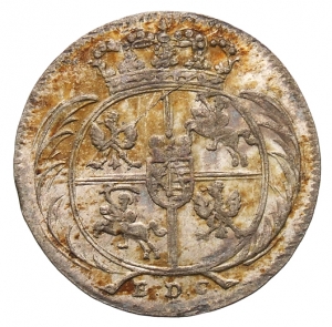 Vorderseite: Das gekrönte fünffeldige polnisch-sächsische Wappen zwischen Palmzweigen, unten Münzmeistersignatur EDC (Ernst Dietrich Croll).