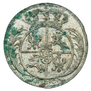Vorderseite: Das gekrönte fünffeldige polnisch-sächsische Wappen zwischen Palmzweigen, unten Münzmeistersignatur EDC (Ernst Dietrich Croll).