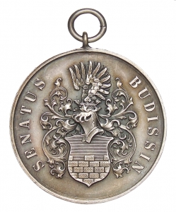 Durchmesser mit Henkelöse 50,2 mm, ohne 39,2 mm. - Schulmedaillen oder Schulpreise wurden in tragbarer oder nichttragbarer Form an Schüler mit hervorragenden Leistungen verliehen. Dieser Bautzener Schulpreis ist eine Prägung von 1921 mit Fortführung des historischen Motivs, aber deutscher Aufschrift. Der Stadtrat von Bautzen beschloss im Jahre 1778 die Ausgabe einer Schulprämie und bewilligte dafür jährlich 6 Taler. Den Entwurf dazu lieferte der seit 1750 amtierende Rektor des Bautzner Gymnasiums Christoph Jeremias Rost. Der Stadtrat nahm den Entwurf 1778 offiziell an und die Verleihungen der „Ratsprämie“ genannten Medaillen lassen sich seit 1794 lückenlos mit Namen nachweisen. Aus finanziellen Gründen erfolgte anfänglich nur eine Verleihung pro Schuljahr. Bei gleichen Voraussetzungen entschied das Los. Später wurden auch mehrere Medaillen pro Jahr verliehen bzw. in Kriegszeiten oder bei fehlenden Voraussetzungen verzichtete man auf die Ausgabe. Ab dem Jahre 1821 wurde die Ratsprämie Abiturienten zuteil, die ‚in den Wissenschaften und Sitten die 1. Zensur erhalten haben’. Ursprünglich hatte die Schulprämie die Form einer Klippe. Ein solches Stück befindet sich im Stadtmuseum Bautzen und stammt aus der Sammlung Erbstein (Sammlung Erbstein Nr. 15838). Später wurden die Stücke in Medaillenform geprägt. 1904 bestellte man einen neuen Stempel, mit dem dann bis in die 30er Jahre des 20. Jahrhunderts geprägt wurde. 1904 (4. Form) wurden elf Silbermedaillen, und 1908 und 1912 je zehn Silbermedaillen geprägt. Für die 2. Form (Punkt hinter BUDESSIN) ist 1837 der Stempel hergestellt worden und die 3. Form (Doppelpunkt hinter BUDISSIN) ist durch den Graveur Christian Joseph Krüger in der Dresdner Münze gearbeitet worden. Die Akten zur Ratsprämie im 20. Jahrhundert geben Auskunft über die Verleihungen und die die Korrespondenz mit der Münzprägestätte. 1921 wurde für die Oberrealschule Bautzen anlässlich des 50jährigen Bestehens der Schule ebenfalls eine Schulprämie in Muldenhütten geprägt. Das Gymnasium Bautzen, in dem die Ratsprämie seit 1778 verliehen wurde, besteht heute als ‚Philipp-Melanchthon-Gymnasium’ und die Oberrealschule Bautzen, gegründet 1871 als Realschule II. Ordnung, als ‚Schillergymnasium’.