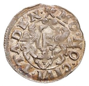 Vorderseite: MO NO CIVI STADEN. Von zwei Greifen gehaltener Stadtschild. Am Ende der Umschrift das Münzmeisterzeichen gekreuzte Zainhaken.